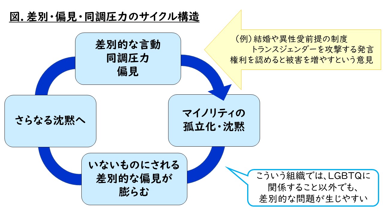 差別や同調圧⼒や偏⾒に満ちた組織では、少数派が意⾒しづらく沈黙してしまい、図(下記)のようなサイクル構造ができ上がります。